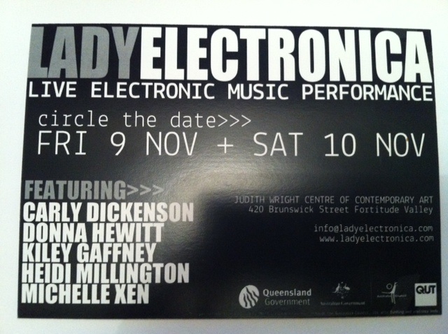 - Lady Electronica Showcase, 9th-10th November, Judith Wright Centre of Contemporary Art 420 Brunswick Street Fortitude Valley