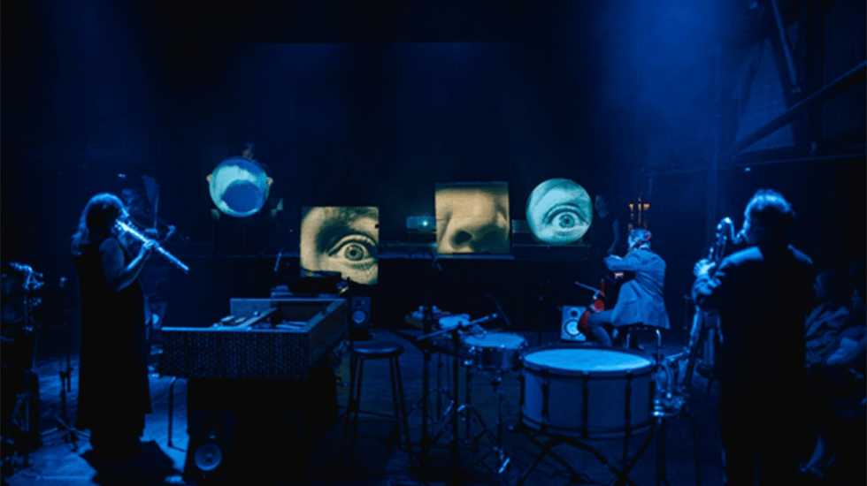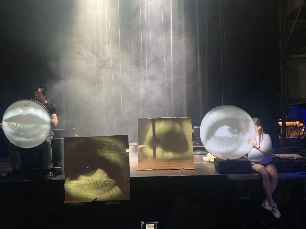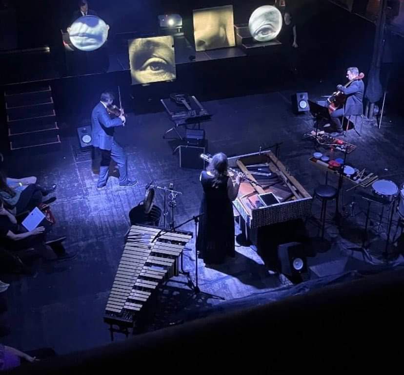 Sum (some) of the Parts exploited facial expressions as the artefact of its musical score. Four improvised screens, two drum skins, and two squares of cardboard captured videographer John Montgomery’s deconstructed images of the composer, Donna Hewitt’s face. Her squinting and blinking eyes, twitching nose, and pouting mouth, rearranged Picasso-like (left eye right of the left, etc.), created a complex and all-too-human emotional landscape. The cello, viola, bass flute, and bass clarinet each followed a different screen, with the sotto voce shimmering viola and the detuning cello grounded by the winds. Ethereal, choral-like, in the middle, the images froze, then swapped to the negative. The music, wavering, quavering, and quivering, moved to a high pitch, then stopped. Paul Doughty 1 Sept, 2024